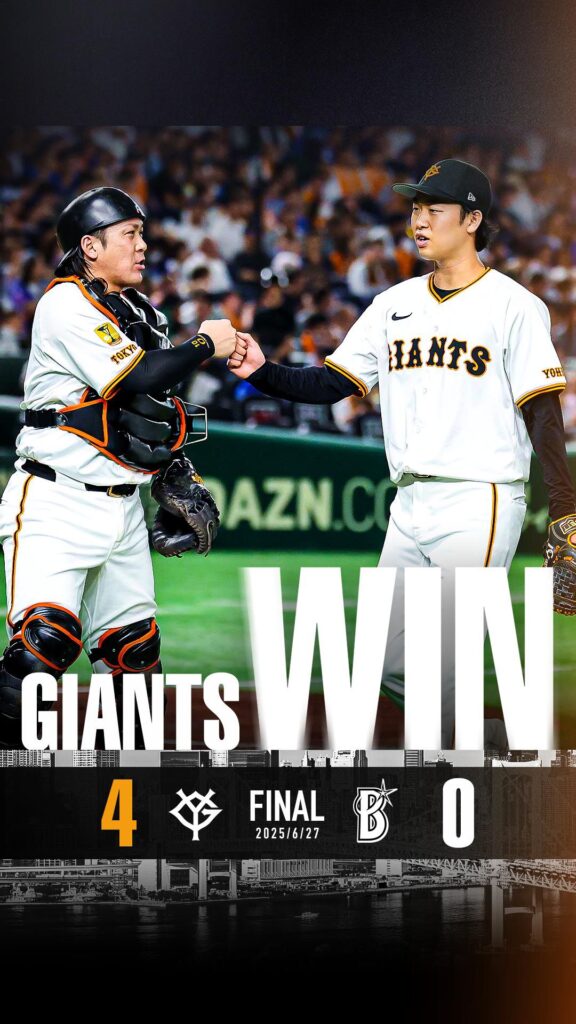 Los Yomiuri Giants derrotaron en el Tokyo Dome por blanqueada de 4×0 a los Dena Baystars con joya de picheo del derecho Iori Yamasaki quien trabajó durante 6.2 entradas permitió 4 hits , no permitió carreras y se llevó la victoria, ahora Yamasaki tiene balance de 7 victorias y 2 derrotas con una efectividad de 1.24 , el juego transcurrió con una mínima ventaja por parte de los locales de una a cero hasta la baja de la octava donde fabricaron 3 carreras para ampliar el marcador , con esa cómoda ventaja los Yomiuri optaron por traer al relevista Hiromasa  Funabasama en la novena entrada pero el mismo se complicó al permitir un doble abriendo la entrada y después de retirar al siguiente bateador otorgó una base por bolas, con hombres en primera y segunda el alto mando de los Yomiuri trajo a su cerrador estrella el cubano Raidel Martinez para solventar la situación, Raidel poncho a los dos bateadores que enfrentó para sellar la victoria de su equipo y se apunto su 25 salvamento de la temporada .