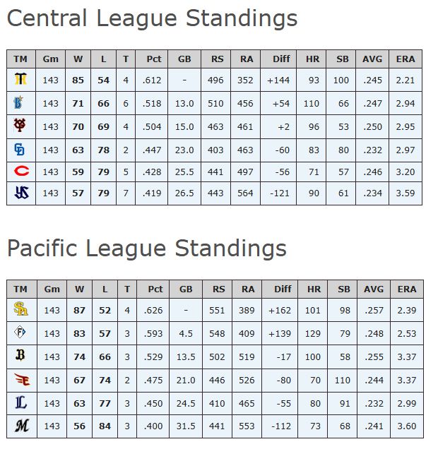 ▪︎ En la Nippon Profesional Baseball cada equipo efectua 143 juegos durante la temporada regular, el circuito está dividido en 2 ligas de 6 equipos cada una y a la Postemporada avanzan los 3 primeros lugares de cada Liga.