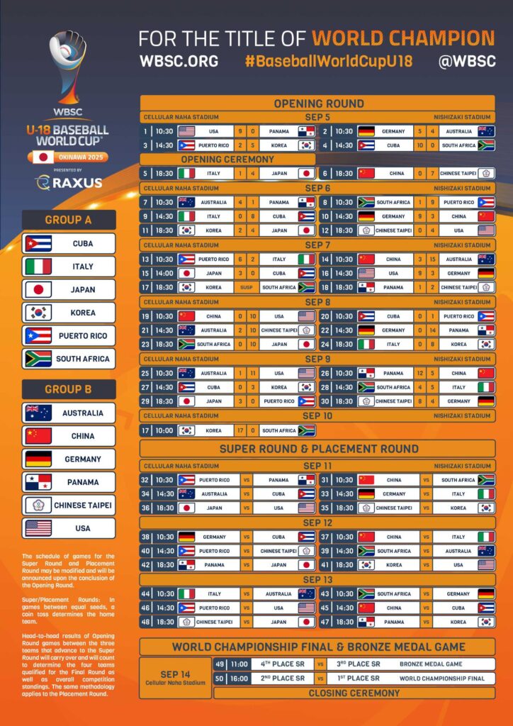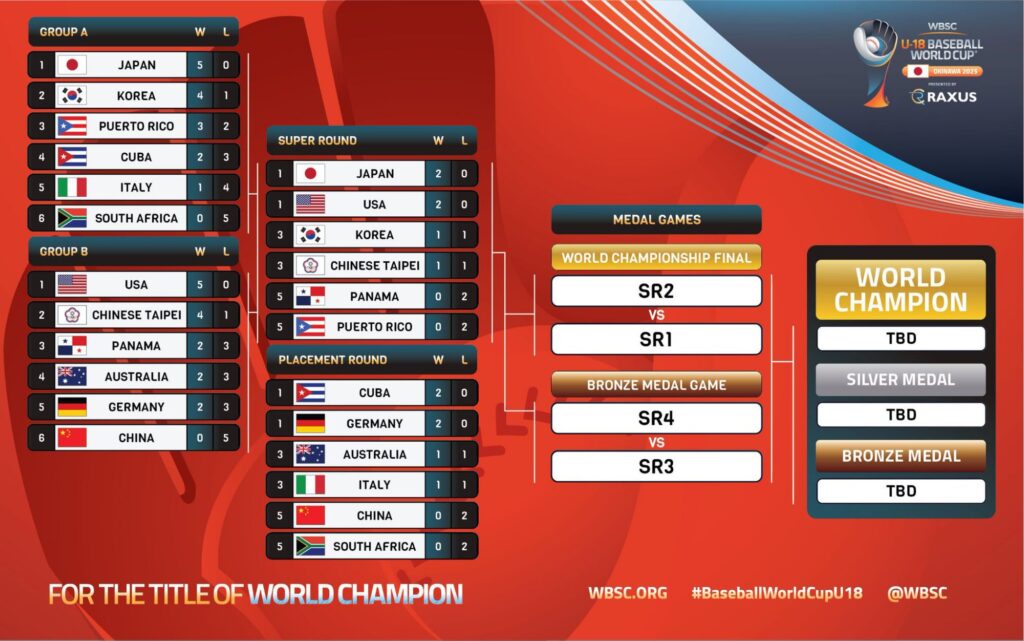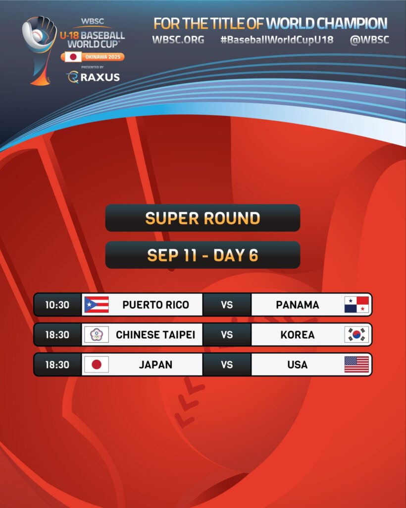 El XXXII Campeonato Mundial de Béisbol Sub-18 WBSC 2025 entra a su estapa decisiva a partir de este jueves 11 de septiembre con la participación de los mejores 6 equipos que avanzaron en sus respectivos grupos a la SUPER RONDA del torneo .