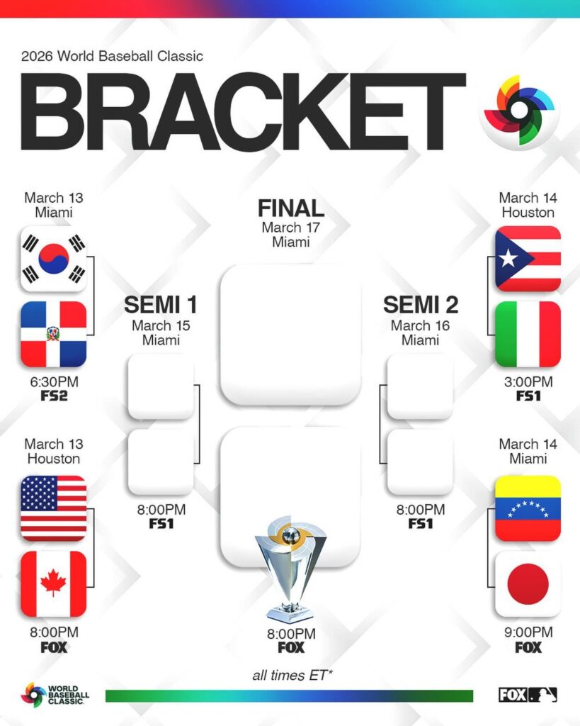 El cuadro final del Clásico Mundial de Beisbol ‘ 2026 y los posibles 8 abridores en los Cuartos de Finales.