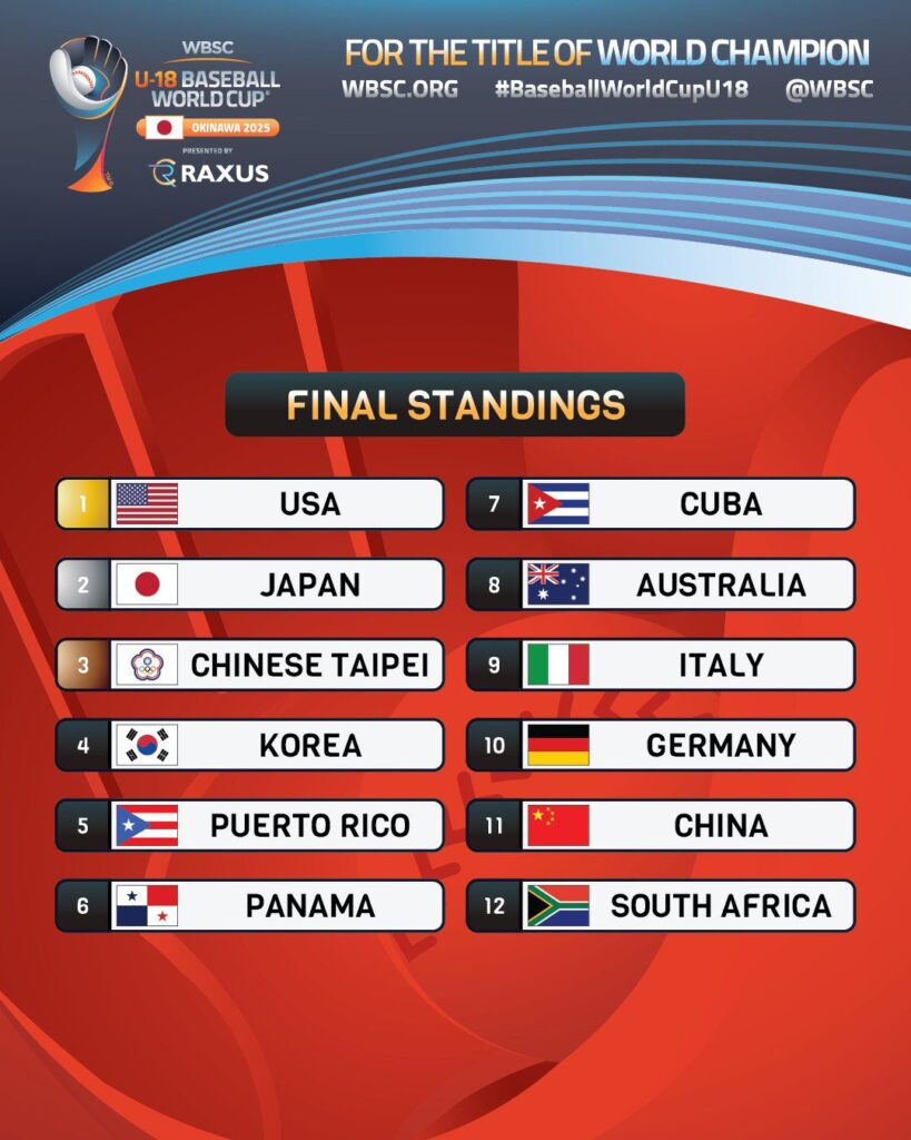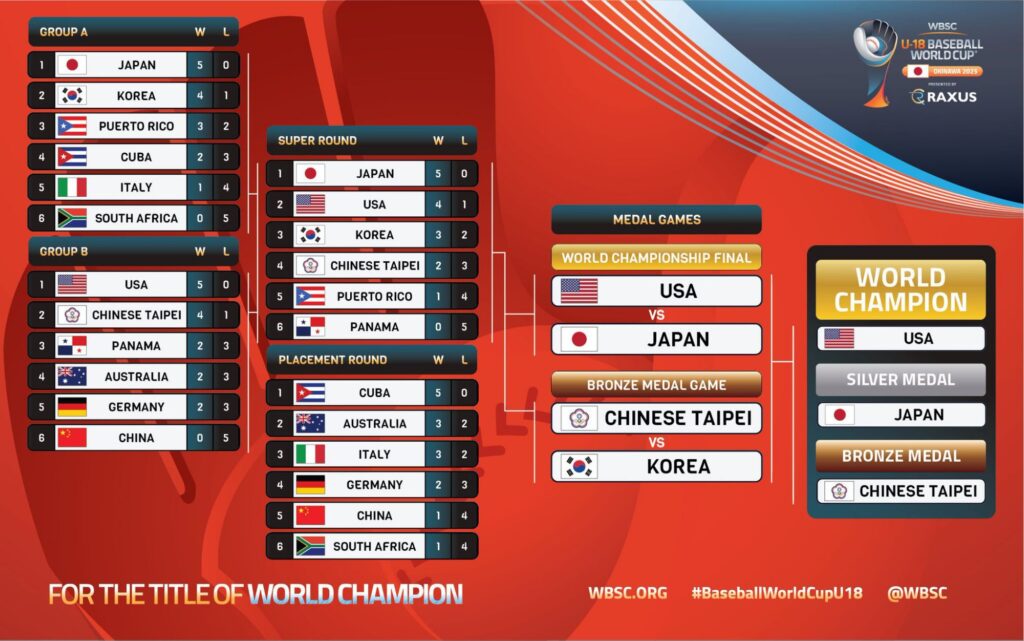 Por su parte Estados Unidos llegó a la discusión del título del orbe con balance de ( 7-1 ) al igual que Japón terminó invicto en la ronda preliminar al dominar el grupo B con balance de ( 5-0 ) , en la SUPER RONDA obtuvo 2 victorias y su única derrota en el torneo fue precisamente contra Japón 6×2 juego que tuvo su definición en extraining ( 8 entradas )