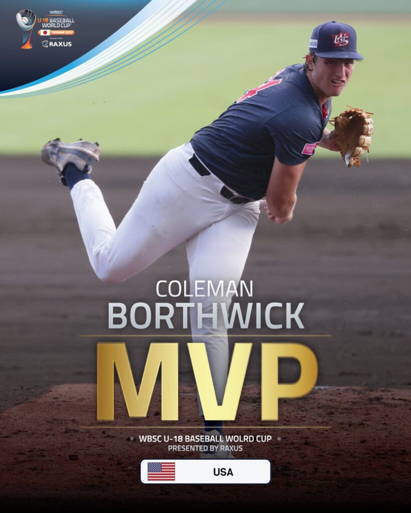 El derecho Coleman Borthwick trabajó una joya de picheo y tránsito la ruta completa durante las 7 entradas para anotarse la victoria en el juego por la medalla de Oro en el Campeonato Mundial de Béisbol Sub-18 que se disputo en la ciudad de Naha en la Prefectura de Okinawa en Japón, Coleman limitó la ofensiva rival a solo 3 hits y otorgó una base por bolas mientras que propinaba 6 ponches, su estrategia de picheo se baso en su bola rápida que alcanzó las 96.3 MPH ( 155 Km/h ) y en los lanzamientos rompientes además de tener un gran dominio de la zona de strike .