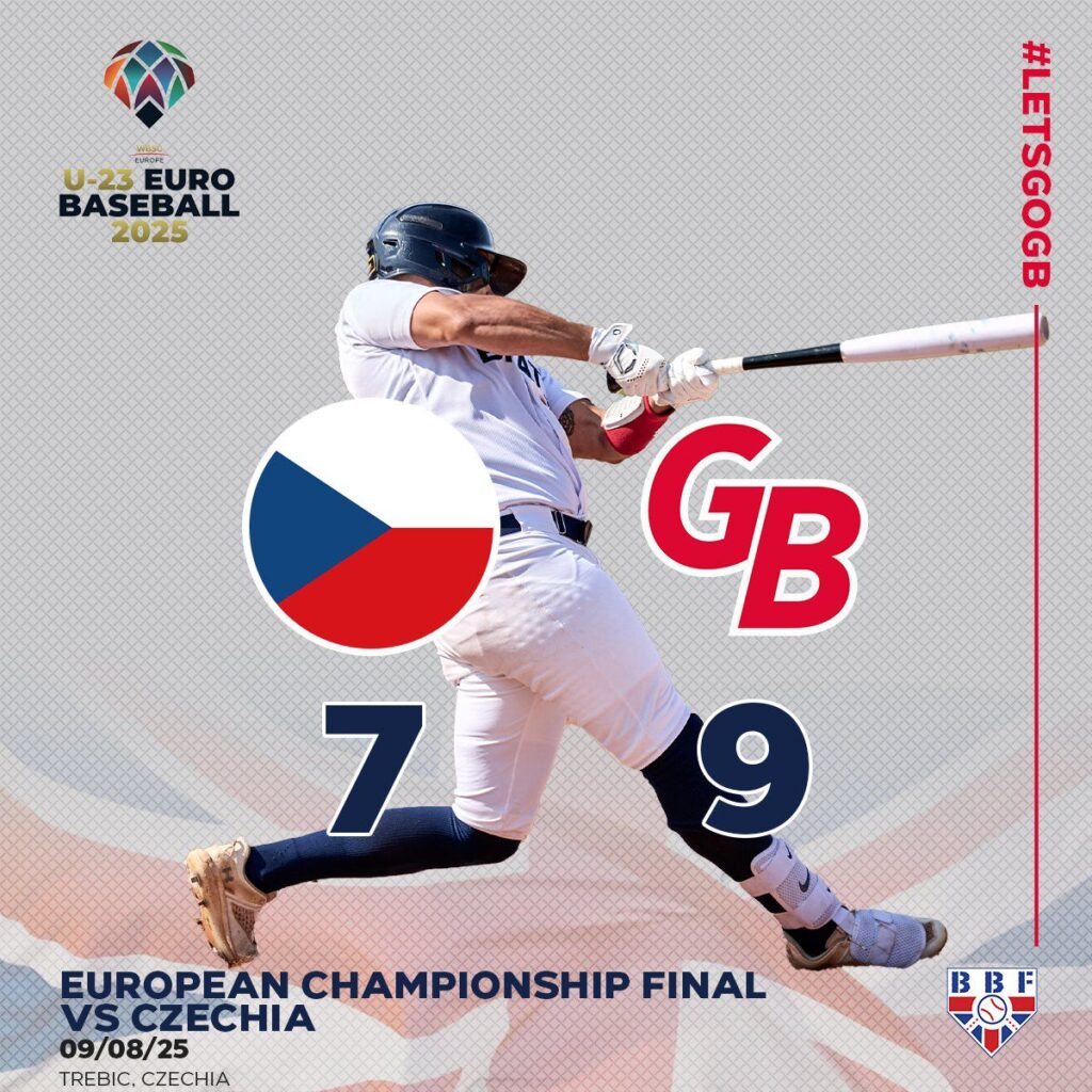 Gran Bretaña perdía 7×0 a la altura de la tercera entrada pero supieron venir de abajo y con una remontada histórica le dieron vuelta al marcador y terminaron ganando 9×7 sobre la República Checa, es el primer título europeo en la historia para Gran Bretaña en el béisbol en cualquier categoría y a nivel internacional es el primer título desde 1938 cuando ganaron la I Copa Mundial de Béisbol para mayores.