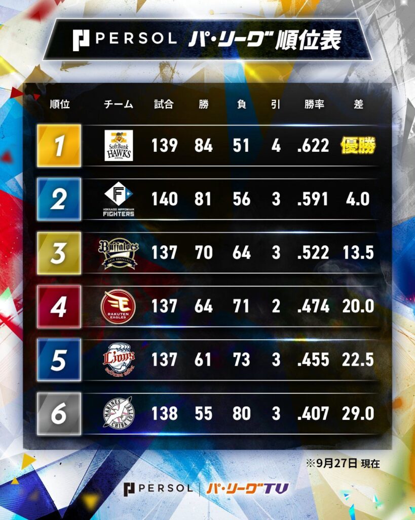 Este sábado los Softbanks Hawks llegaban al juego contra los Saitama Seibu Lions con un número mágico de 1 , una victoria de ellos o una derrota de los Nippon Ham Fighters les daría el título de la Liga, los Fukuoka Softbanks Hawks después de haber barrido en tres compromiso a los Rakuten Golden Eagles extendieron su racha de victorias a 4 , tras imponerse con marcador final de 4×1 a los Saitama Seibu Lions con una gran actuación montícular de su abridor Kohei Arihara quien trabajo durante 7 entradas permitiendo una carrera y se llevó su victoria número 13 de la temporada .