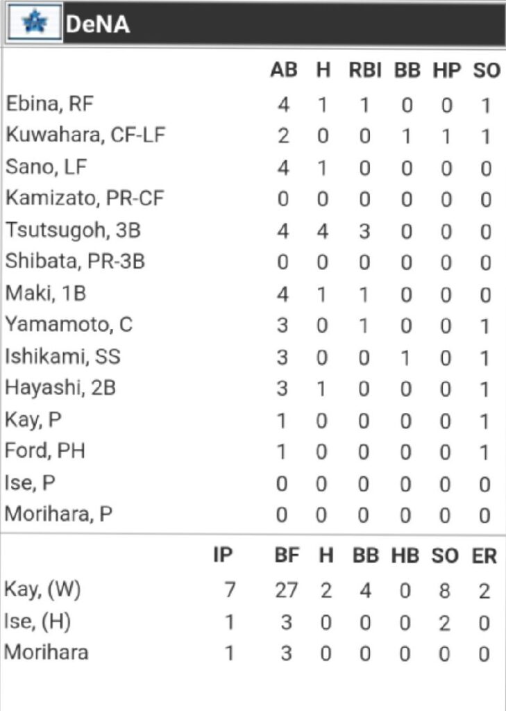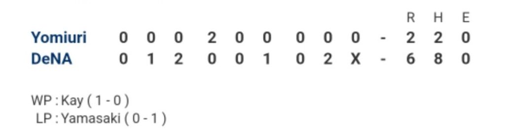 Los Yokohama Dena Baystars se impusieron en el primer juego de la SERIE CLIMAX en la Liga Central al derrotar 6×2 a los Yomiuri Giants , el lanzador estadounidense Anthony Kay lanzó un gran juego de pelota durante siete entradas para llevarse la victoria y contó con el apoyo ofensivo de Yhositomo Tsutsugoh quien bateo en este encuentro de 4-4 con dos Home runs e impulsó tres carreras .