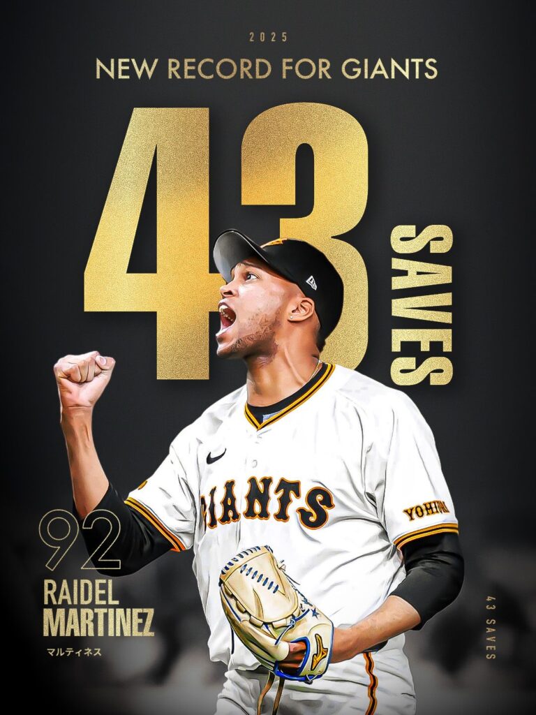El cubano Raidel Martinez logró su salvamento número 43 en la presente temporada para establecer un nuevo récord dentro de la franquicia de los Yomiuri Giants cifra que pudiera aumentar ya que a su equipo le restan 8 juegos por disputar en la actual campaña de la Nippon Profesional Baseball , el anterior récord estaba en poder de Kentaro Nishimura con 42 salvados establecido en la temporada del 2013 .