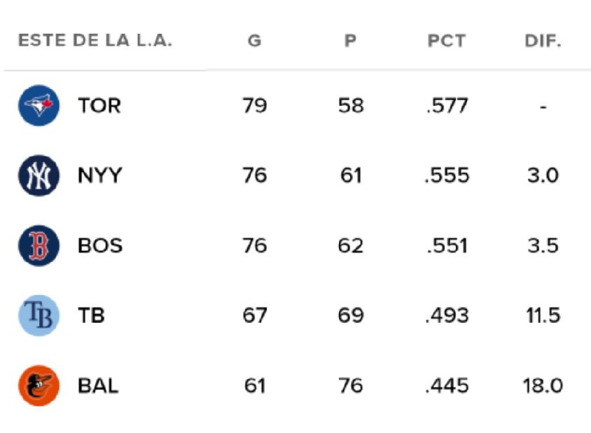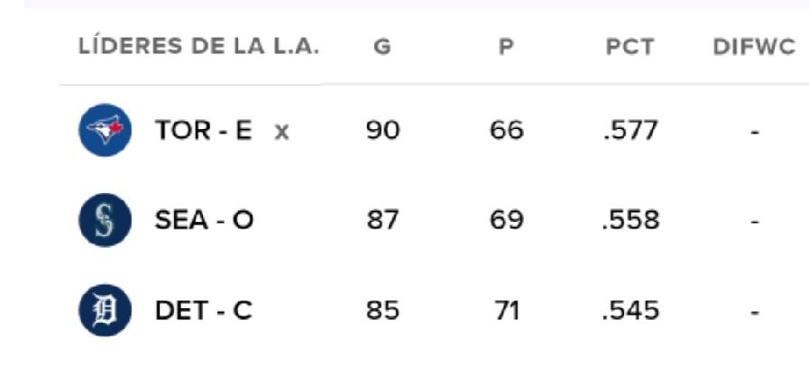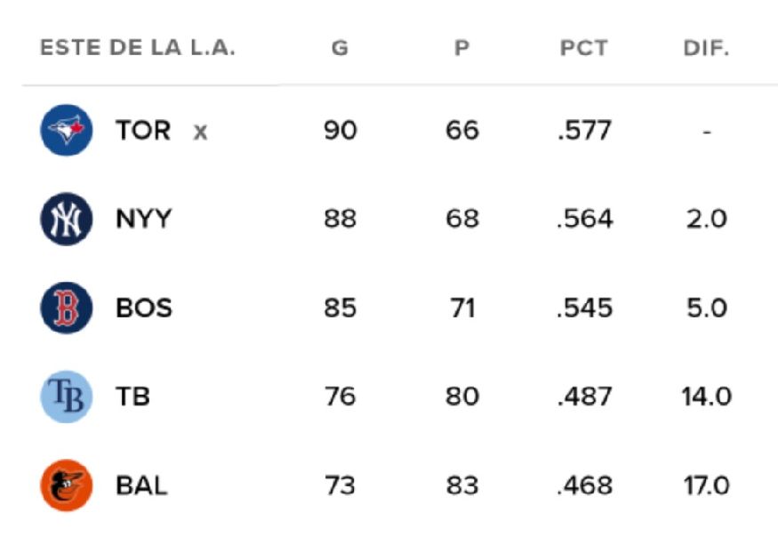 Los Toronto Blue Jays aseguraron este domingo su presencia en la postemporada de la MLB tras derrotar a los Kansas City Royals con marcador final de 8×5 convirtiéndose en el primer equipo de la Liga Americana que lo logra, en estos momentos son líderes de la división y le sacan 2 juegos de diferencia a los New York Yankees ocupante de la segunda posición, además con 90 victorias son el equipo que más juego han ganado en el joven circuito, los Toronto necesitan terminar esta semana con balance de ( 4-2 ) para asegurar el banderin de la división e inclusive jugando para .500 ( 3-3 ) obligaría a los New York Yankees ha ganar los 6 juegos , en caso de empate entre ambos equipos al final de la temporada el desempate le favorecía a los Toronto Blue Jays quienes se impusieron a los Yankees de New York en el compromiso particular por ( 8-5 ).