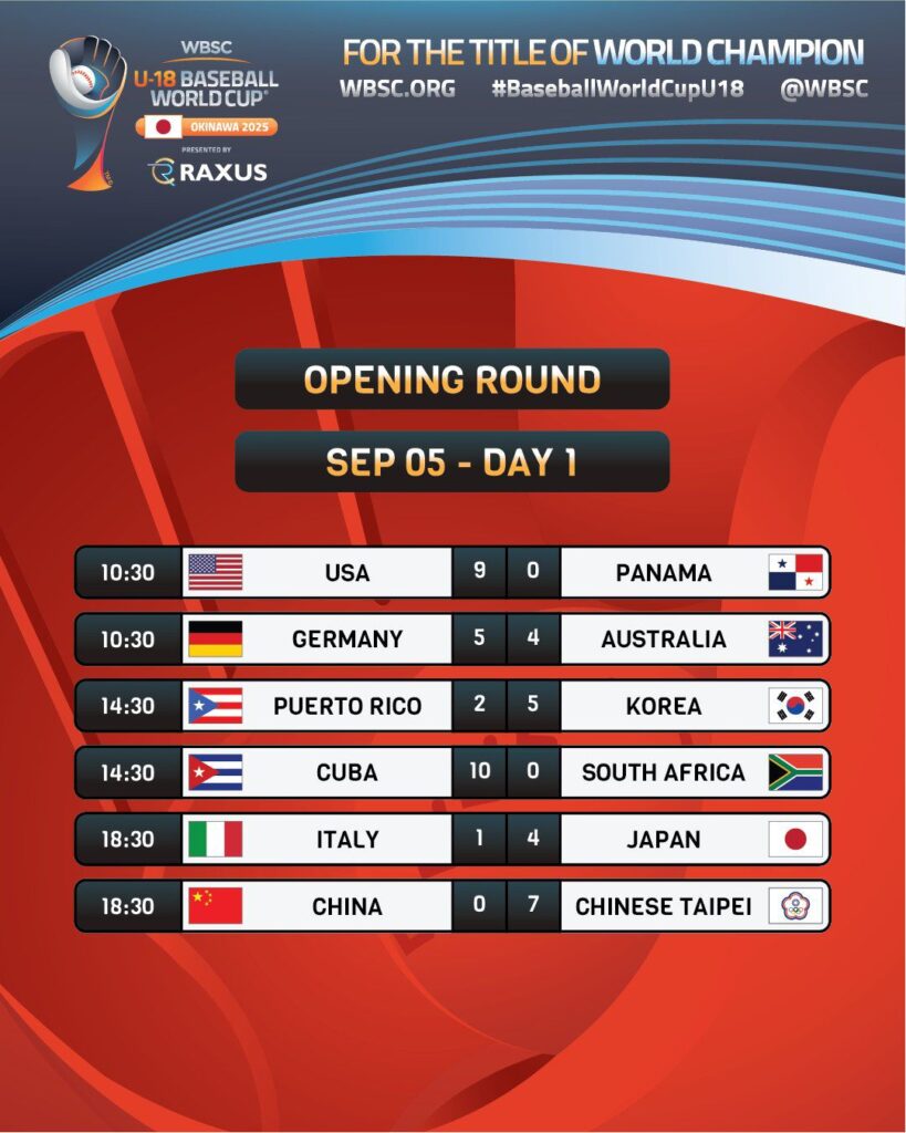 Resumen Primera Jornada del Campeonato Mundial sub-18 de béisbol WBSC 2025 .