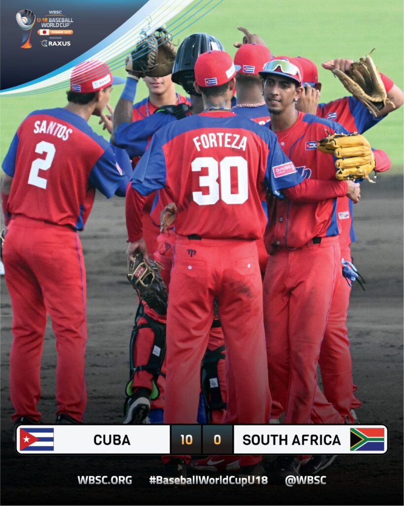 La selección cubana de Béisbol Sub-18 debutó en el Campeonato Mundial derrotando convincentemente a Sudáfrica a priori el rival mas asequible dentro del grupo A , los de la mayor de Las Antillas ganaron 10×0 en 5 entradas, los cubanos anotaron una carrera  en el primer ining y agregaron racimo de seis en la parte conclusiva de la segunda entrada y añadieron 3 anotaciones mas en la tercera entrada, el lanzador cubano Leandro Forteza se mostró a gran altura y  trabajó las 5 entradas donde permitió un hit , regalo un boleto y otorgó 5 ponches, por los antillanos los mejores a la ofensiva fueron su primer y segundo bateador , Jonathan Moreno 3-2 con 2 carreras anotadas y una impulsada y Yoan Aguila  Martin de 3-2 con 2 anotadas , el equipo de Sudáfrica cometió 6 errores en este encuentro .